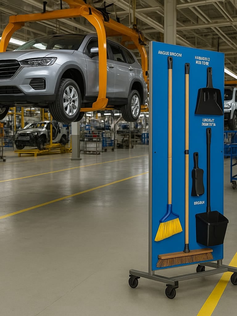 Using a Shadow Board Cleaning Station Moving/ mobile speeds up daily activities, increases productivity, and improves overall workspace organization.